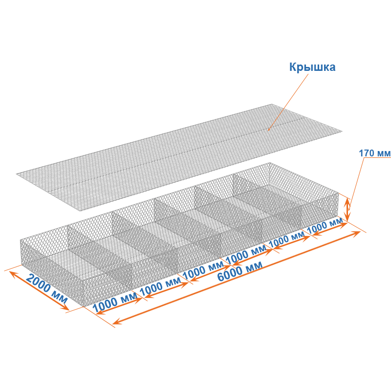 Пример применения: укрепление откосов и русел на типовых участках; заполнение камнем фракции крупнее 60х80, фиксация крышек и кромок после выверки отметок.